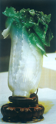 台北故宫的翠玉白菜共有三棵,是台北故宫最为知名的宝贝。这件与白菜相似度百分之百的作品,是以一块半白半绿的翠玉为原材琢碾而成,洁白的菜身,翠绿的叶子,以及菜叶上停留的两只昆虫(分别为寓意多子多孙的蝈蝈和蝗虫),让人倍感亲切。此作品原置于紫禁城永和宫,也即光绪帝瑾妃的寝宫,因此有人推测此器为瑾妃的嫁妆。白菜寓意清白,象征新嫁娘的纯洁,昆虫则象征多产,祈愿新媳妇能子孙众多。不过,由于保管不善,图中这棵最常露脸遭到了损坏,蝈蝈的一根长须断了一小截,令人遗憾。
