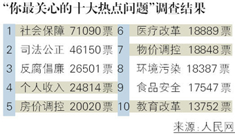 在全国两会开幕前夕的1月底至31,人民网推出了“2011两会调查:你最关心的十大热点问题调查。在这十个热点问题中,我们选取了与民生密切相关的六个领域,结合2011年政府工作报告一一解读。