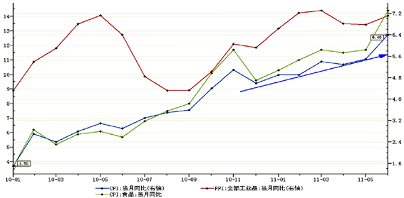 6月份,CPI在翘尾因素和食品价格“双轮驱动”之下,同比涨幅达到6.4%,创出35个月以来新高。从结构上看,食品价格的走势仍在很大程度上影响CPI的运行,非食品价格开始稳定。“猪周期”卷土重来,对CPI影响很大。食品类价格同比上涨14.4%,影响价格总水平上涨约4.26个百分点。