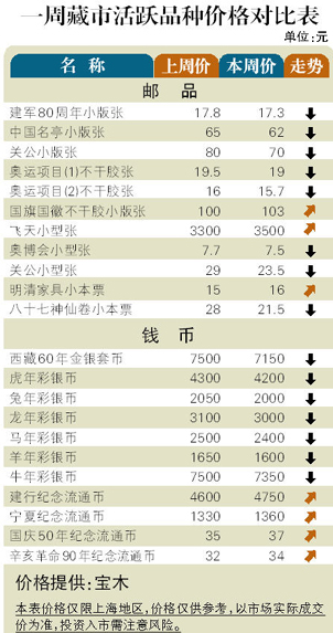 国庆期间,藏市表现较为温和,“老邮”俏、新邮滞的状态并未改观,而金银币下调走势延续。邮市:JT中的“齐白石”套票在1050元整固,但其他品种则继续走强,如“猛禽”和“徐霞客”分别在50元和48元成交,“古钱币(1)”、“畜牧牛”、“梅花鹿”和“兵马俑”套票分别上扬到150元、90元、92元和43元。近期新发行的“关公”和“辛亥革命”小型张均现大幅高开,短期风险毕露,而“八十七神仙卷”小本票在10天内已下挫40%。币市:金银币回调格局未见回转,成交也凝滞。而前两年炙手可热的第四版人民币抛压沉重。