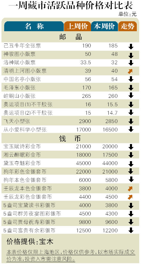 踏入12月初的藏市,即现价格拉锯迹象,大多数热门品种价格涨跌频繁,但下有支撑上有压力的局面却未改变,惟短线客难以适应变化无常的波动,只能无奈选择自我“下岗”。邮市:9月份以来发行的新邮成为近期下跌主流,其中“天津滨海新区”、“美好家园”和“无锡亚展”小型张均跌破6元面值,本周初分别下挫到4元、4.2元和5.5元,不过,“富春山居图”小版票却逆势上扬至93元。币市:“壬辰龙”金银币成为近期成交活跃板块,上周的颓势有所改观,其中“壬辰龙”彩金银套币和本色套币在分别回调至4100元和3700元后,上周末分别回升到4550元和4100元,而5盎司“壬辰龙”彩银币也反弹到7600元附近。