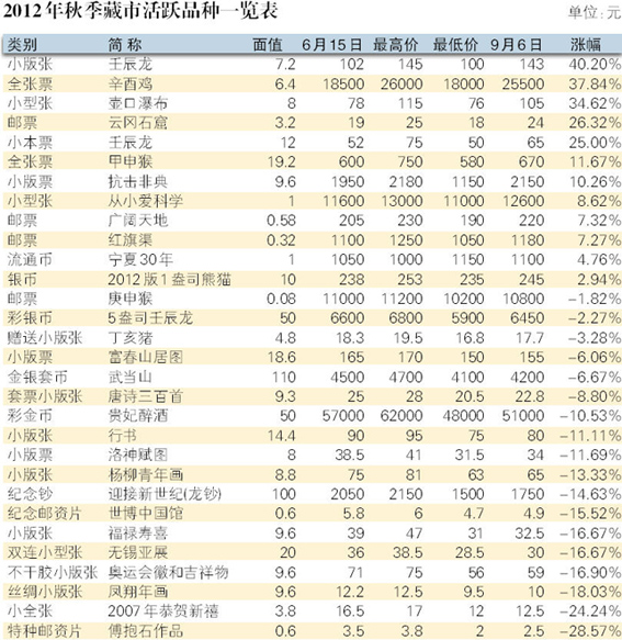 借助于7月份的反弹,今年发行的新邮一度出现回升走势,但好景不长的是随着反弹匆匆离去,近期发行的新邮也由高开演变成高台跳水。如“伦敦奥运会”小版张从面世初的23元不断回调,到9月初已跌至12.5元,下滑幅度逾40%,而“福禄寿喜”、“共青团90年”和“红色足迹”小版张分别下沉到31元、8.2元和19元。8月初发行的“丝绸之路”同样高开低走,其中“丝绸之路”小版张由30元跌至17.5元,小型张从14元下沉至8元,8月末发行的“和田玉”小全张更是面世之日即打折,折扣率为20%。从新邮的走势可发现,近期市场弱势形态可见一斑,至少新邮的高开低走乃至打折也在很大程度上反映出“歇夏期”对邮市的负面影响。