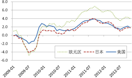 2012年以来全球主要经济体通胀走势均进入了下行通道,2013年全球通胀压力预期将进一步减轻。首先,中长期来看,美强欧弱的经济格局以及欧债危机冲击并未远去背景下的美元避险情绪特征,决定了美元汇率的中长期强势状态,使得大宗商品价格难以大幅度反弹。其次,从供需来看,在无突发性事件发生情况下,大宗商品供给不会出现大幅波动,此时关注重点是需求方。而在大宗商品的最主要消费大国中,中国当前经济增长已经放缓,美国经济复苏仍较缓慢,由此导致的需求走弱也是大宗商品价格下行的一个重要原因。尽管2012年下半年中国经济的逐步改善能够一定程度支撑需求回升,但这种支撑力度不太可能会使得国际商品市场价格出现大幅反弹。第三,大宗商品价格弱势局面的延续,会明显减轻各国输入性通胀压力。目前全球经济增速普遍放缓,消费需求的疲软也反过来使得内生性通胀高企的可能性大大减小,这也为稳定经济增速启动新一轮经济周期和全球货币政策的进一步宽松创造了条件。