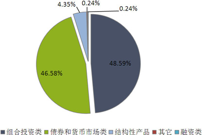 从投向类型来看,债券与货币市场类产品发行2109款,环比增加134款,市场占比上升1.46个百分点至46.58%;组合投资类产品发行2200款,环比增加63款,市场占比下降0.23个百分点至48.59%;融资类产品发行11款,环比减少6款,市场占比下降0.15个百分点至0.24%;结构性产品发行197款,环比减少32款,市场占比下降0.88个百分点至4.35%;其它类产品发行11款,环比减少9款,市场占比下降0.21个百分点至0.24%。(图4