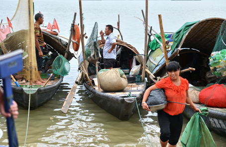 女主人提着鱼鲜和杆秤涉水上岸,男主人在和邻船的同行聊天。