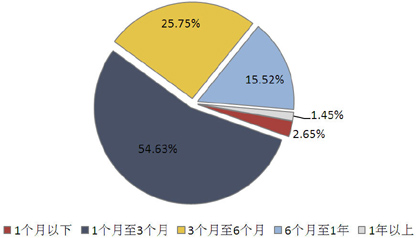 从投资期限来看,1个月及以下产品发行130款,环比减少35款,市场占比下降0.66个百分点;1-3个月产品发行2679款,环比增加83款,市场占比上升2.58个百分点;3-6个月产品发行1263款,环比下降156款,市场占比下降2.69个百分点;6-12个月产品发行761款,环比增加37款,市场占比上升1.00个百分点;1年以上产品发行71款,环比减少13款,市场占比下降0.24个百分点。(图3)