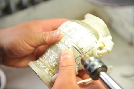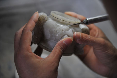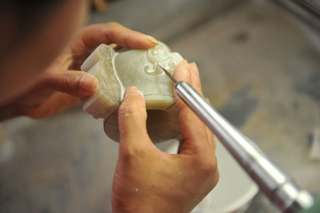 说着话儿,闫楠一直没停下手里的活,她身子向前倾着,一个青海料的仿古香炉在她手里熟练地转来转去,在雕刻机钻头刺刺的响声中不断换着角度,同时反复用水冲刷。这是她每天都要重复的动作。
