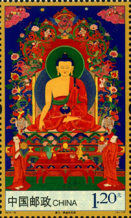 唐卡绘画艺术是西藏文化的奇葩,千余年来影响深远,也是中华民族民间艺术中弥足珍贵的非物质文化遗产。为宣传我国非物质文化遗产,中国邮政于2014年5月18日发行了《唐卡》特种邮票1套4枚,小型张1枚。该套邮票表现内容分别为:释迦牟尼佛、无量寿佛、绿度母和白度母,小型张则为千手千眼观世音菩萨。邮票图案均系故宫博物院珍藏品。为了突出唐卡的地位,这套邮票采用了较为少见的大规格票幅,再现了唐卡精美之细节,而小型张边饰采用金色与唐卡相关的花纹纹样,增添了整套邮票金彩辉映的奇丽意境和独特性。