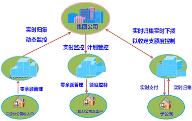 “集团公司设总账户‘现金池’,负责分、子公司上存资金的归集、下拨,各分、子公司收支两条线管理,收入户为零余额账户,所收款项由系统实时自动上存,所付款项由总账户自动按额度下拨。”