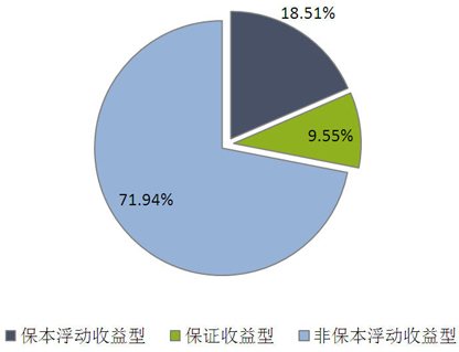 从收益类型来看,保证收益型产品发行了342款,环比减少194款,市场占比下降2.17个百分点至9.55%;保本浮动收益型产品发行了663款,环比减少25款,市场占比上升3.47个百分点至18.51%;非保本浮动收益型产品发行了2576款,环比减少773款,市场占比下降1.30个百分点至71.94%。(图1
