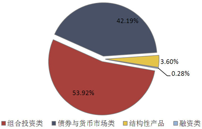 从投向类型来看,债券与货币市场类产品发行了1511款,环比减少529款,市场占比下降2.41个百分点至42.19%;组合投资类产品发行了1931款,环比减少344款,市场占比上升4.17个百分点至53.92%;融资类产品发行了10款,环比减少13款,市场占比下降0.22个百分点至0.28%;结构性产品发行了129款,环比减少106款,市场占比下降1.54个百分点至3.60%。(图4