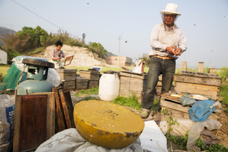 采蜜是养蜂人一天中最重要的工作,当然也是最幸福的时刻。辛勤的劳作后终于看到了收获。采蜜开始后,张师傅从选择的蜂箱中小心翼翼的抽出巢脾,然后用细软的毛刷轻轻拂去还停留在蜂巢上面的蜜蜂,再交由身旁给他帮忙的岳父。老人家把巢脾插进摇蜜机,摇动把柄,利用离心力把蜂蜜从蜂巢里甩出来收集到桶里。就在这当口,附近村庄的村民闲逛到蜂场,张师傅忙掰了一大块饱含蜜汁的新鲜蜂巢请他品尝。香甜的滋味让这位不速之客直咂吧嘴。随后,张传谦把巢脾上一些形状不规则的蜂巢用小铁钎铲下来收集到一起,用喷烟器驱走逗留的蜜蜂,放到锅里再熬成蜂蜡。喷烟器里装的是加工蜂蜡时形成的渣滓,既无毒无害,驱蜂效果又好。粗加工成形的蜂蜡是紧俏货,会有人定期上门收购,经过进一步的深加工,被用来提炼应用于军工制造和美容护肤品生产的辅助原料。