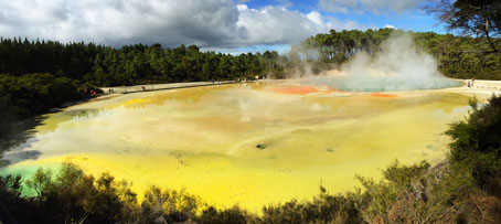 “WAI-O-TAPU”在毛利语中有“圣水”的意思。这个被称为大自然调色盘的地热公园,是由早期火山喷发所形成的岩浆地热。其中最著名的是每天早上10点15分Lady Knox Geyser间歇喷泉,喷出的水柱高20-30米。这可不是普通的喷泉,是地热直接喷发出带着浓厚的硫磺气味的喷泉。解说在10点时准时出现在喷泉旁,先是有人往里面倒了点东西,应该就是这喷泉的引子,几秒钟后喷泉开始跃跃欲试,解说也迅雷不及掩耳之势的跑开了,一点点、一点点,水柱越来越高,直到形成烟雾缭绕般,仰起头,水柱已升至大概有30米左右的高空了。