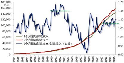 自2月以来,财政存款呈现回笼规模低于季节性,而投放规模高于季节性的特点。截至2014年底,财政支出12个月累计滚动额约在15.1万亿元,今年5月末升至15.8万亿元;相应12个月滚动累计赤字规模约在1.1万亿元,今年5月末升至1.4万亿元。今年4月更是出现全国公共财政支出同比大增逾三成的情况,令市场猜测财政政策或已由实质上的紧缩转向宽松。