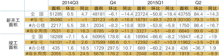 表3 2014Q3-2015Q2房屋开工及竣工情况 单位:万平方米,%
