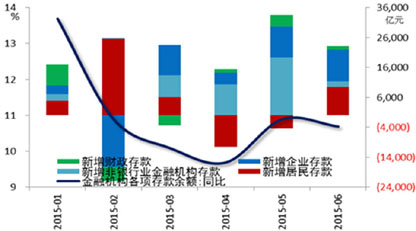 金融:前期货币增速的回升,同降息降准效果逐渐显现,银行放贷意愿有所恢复,以及央行在股市剧烈波动的高风险时期,通过多种方式补充流动性有关。但在资本市场经历剧烈波动后,货币政策继续采用通过向金融市场注入流动性来实现宽松的可能性有限,伴随股市在6月告别阶段性峰值,后期股市放缓会降低各方融资需求,货币增速或重新回落。从6月新增存款结构来看,非银行金融机构存款新增规模已显著下降,而居民存款、企业存款新增规模不同幅度上升,也印证了股市相关资金回流理财和银行自营的趋势,相应银行负债端结构将更为稳定。