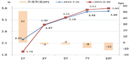 7月受股市动荡避险需求上升、一级市场招标结果较好带动二级市场的影响,国债收益率曲线平坦化,截至7月31日,国债1年期收益率较6月末上行了52bps,3年和5年期下行3bps,7-10年下行9-12bps。(图5)