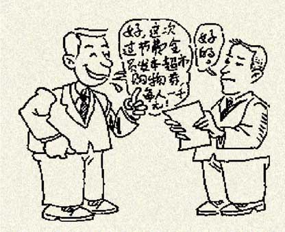 王二的理想还是破灭了。他原本希望通过这种方式花掉手上的购物券,或者说,把购物券撒到社会上去,但大部分人拿到购物券后还是很快回来超市换成东西。
