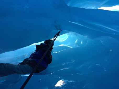 到达冰川上,由向导带路,不停的为我们开道。在坡道上,就用铁锹撬出楼梯一样的雪路。看到一些冰洞,向导会先过去看看有没有危险,确认安全后,便让我们一个个排队进去拍照。在冰川上行走并不容易,需要套上了冰爪的登山靴,还必须每一步都用力向下蹬,冰爪才能插入冰面。
