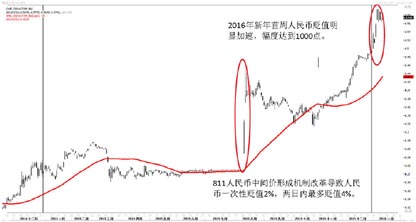 1月至3月上旬人民币持续走弱,最高成交在6.2763。3月中旬人民币连续大幅走强,最低至6.1805。3月下旬至7月底市场主要在【6.19,6.22】区间震荡,整体价格变动不大。8月11日,人民银行宣布完善美元对人民币中间价形成机制,使人民币汇率朝着更加市场化的方向迈进,“811汇改”使得人民币一次性贬值2%。12月1日,人民币在其国际化进程上再次迈出重要一步,国际货币基金组织(IMF)宣布正式将人民币纳入特别提款权(SDR)货币篮子,人民币也成为继美元、欧元、英镑和日元后的第五种货币。经历了2个月的调整,从2015年11月初开始,人民币揭开了持续贬值的序幕,USDCNY从6.35升至2016年1月8日的6.59,贬值幅度约3.8%。单是新年首周,人民币贬值幅度达到1000点(合1.54%)。(图1)