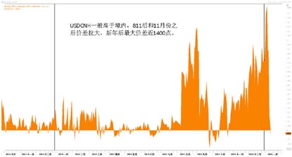 2015年,美元兑离岸人民币整体呈整体上涨走势。年初,USD/CNH开盘6.2170,12月31日收盘价格为6.5680。波动区间为[6.1850,6.6098]。2015年初至8月,境外美元兑人民币汇率稳中有升,多数在6.2附近小幅波动。2015年8月11日,中国人民银行宣布完善人民币对美元汇率中间价报价,人民币兑美元汇率中间价一次性贬值近2%至6.3878,上半年与境内人民币逐渐缩窄的点差陡增至647个点。新年后前两周,受到境内人民币贬值影响,USDCNH大幅攀升,曾经一度升至6.75,和境内价差超过1500点,但受到境外人民币资金紧张和监管机构干预的影响,USDCNH很快回落至和境内价格一致。