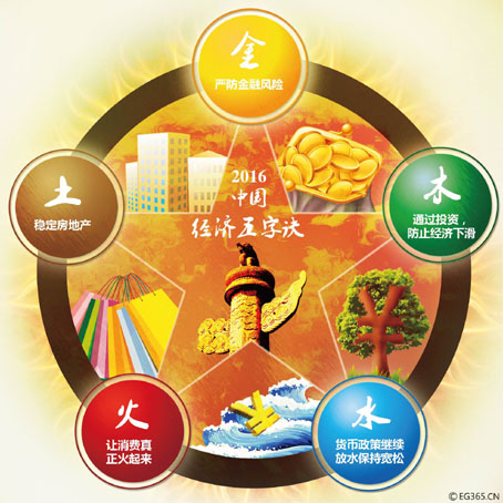 有专家形象的将2016年经济工作总结成五个字:金木水火土。金,就是要严防金融风险,2016年,以企业债为代表的各种风险仍然在考验羸弱的中国金融的安全堤坝,企业债违约,银行不良贷款飙升会成为常态;木,就是仍然会通过投资,通过十三五的一些大项目的带动,防止经济的下滑;水,就是货币政策继续放水保持宽松,财政政策在加大赤字的同时,下决心减税,为企业减负;火,就是让消费真正火起来,中国经济的未来在消费,消费的扩张和升级需要系统政策,让国内的消费火起来,能挽救很多行业;土,当然就是要稳定房地产,2016年的房地产政策注定是2008年金融危机以来最宽松的一年,会出台包括房贷利息抵个税、农民购房补贴、首付回到20%2016年经济稳不稳,其实最终仍然取决于房地产。