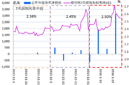 2016年首月资金面出现收紧趋势,7天回购利率月度中枢为2.50%,较上年12月的2.45%上升5bps。(图1)