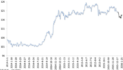 1月,日元对美元先涨后跌。月初,全球股市、原油市场纷纷惨淡开年,美国及中国股市遭遇大规模抛售潮,标普500跌至2014年10月以来最低水平,沪指跌入熊市,甚至日本股市也正式进入技术定义上的熊市,加之油价暴跌,击穿30美元/桶整数关口。在此背景下,传统的避险资产——日元受到投资者大幅追捧,日元对美元快速升值。1月20日,日元对美元最高触及115.96的逾一年高位。1月29日,日本央行货币政策会议后超市场预期宣布执行“负利率”政策,引发资本市场剧烈动荡,日元一度暴跌2%,连续突破119、120和121三个整数关口后小幅回调。截至1月29日收盘,日元对美元报121.12,较2015年末小幅贬值0.75%。(图5)