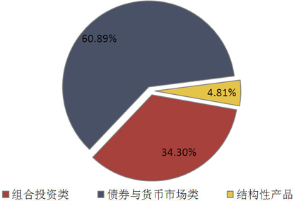 从投向类型来看,债券与货币市场类产品发行了3928款,环比减少882款,市场占比下降1.13个百分点至60.89%;组合投资类产品发行了2213款,环比减少393款,市场占比上升0.70个百分点至34.30%;结构性产品发行了310款,环比减少29款,市场占比上升0.43个百分点至4.81%;融资类产品仍然没有发行。(图4)