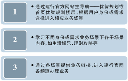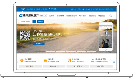 网站首页化,采用蓝、白、橙主色调搭配并大量运用场景图片,缩减页面篇幅,优化信息展示,整体视觉效果更佳。用户可通过首页顶部进入个人客户、公司机构、小微企业、私人银行、集团网站等专属服务页面;个人客户通过快易金融悦享生活优智规划楼层等可对建行业务有更加清晰直观了解;用户通过首页快速服务通道,能够快速办理账户查询、生活缴费、业务申请、网点预约等用户常用生活功能服务;同时利用宽频广告、图文并茂的场景设计、简洁明了的文字配置,给用户更亲切体验。