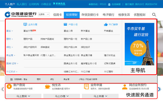 首先,新版网站操作界面简洁清晰,用户可快速定位和使用网站功能服务。如首页主导航变,基于建行业务的系统化整理,根据产品服务属性和用户访问习惯依次划分信用卡、投资理财、存贷及银行卡、电子银行、悦享生活、优智规划等模块,并进一步对各模块划分业务办理、产品信息、热门推荐三个二级分类,便于用户一键直达目标页面。同时,网站在各个频道首页均设置快速服务通道,用户可实现投资理财、生活缴费、业务预约等日常高频业务快速办理,使得操作更加流畅、时间更加节省。