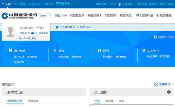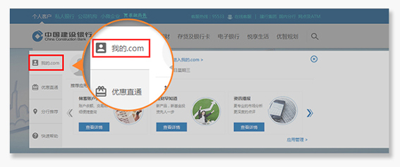 新版网站立足以客户为中心的服务理念,以用户需求为出发点,部署产品服务,新增我的.com”模块,实现用户对个人信息的全方位管理,为不同用户更加精准的推送服务内容。一是用户无需进行网站注册,即可凭建行账户或建行网银账号直接登录我的.com”享受各项服务,如个人专属应用服务定制、生活服务、优惠信息等;二是可统一管理个人信息,使用交易记录查询申请进度查询网点预约等服务;三是可直接进入我的悦生活我的信用卡我的善融我的理财我的保险等分用户中心;四是可查询用户本地的优惠服务信息,使用服务指南常见问题理财计算器产品决策器等实用工具。