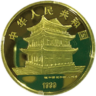 京剧《贵妃醉酒》描写唐明皇宠妃杨玉环设筵百花亭,欲与明皇同饮共乐。久候不至,又悉转驾西宫。羞怒之际,命高力士伺奉,自饮大醉,怅然回宫。金币画面上的杨贵妃头戴凤冠,身披凤袍,容颜丰满俏丽,面颊绯红羞涩,酒醉后的神态既放荡浪漫而又显得娇媚羞涩,含蓄的眼神似乎有一种穿透力,让人感受到“回眸一笑百媚生”的娇柔之美和万种风情。币图主体画面是京剧著名的“卧云”舞姿,给人以轻盈、舒展的柔美感觉,画面流贯着美的线条和韵律。“卧云”是京剧演员的一种基本功,也叫“卧鱼”。演员斜托掌式右别步站立,然后两腿缓缓卷屈,下蹲,成盘卧姿势,演员仰望着天空的彩云的变化,觉得自己也在虚幻缥缈的云端,和彩云融合成一体,姿势非常柔美。