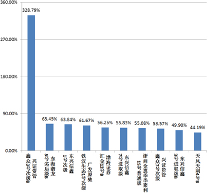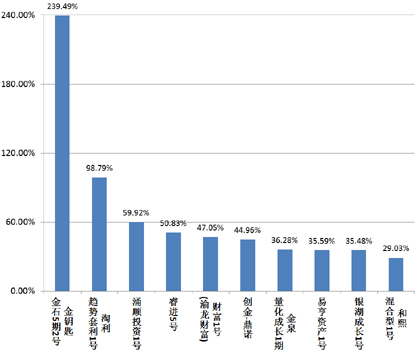 从表现最好的产品收益情况看,前十位产品均为结构化产品次级,其中股票型5款、混合型4款、债券型1款。本月收益最高的产品收益突破200%,然而净值仅0.283。前十产品中,净值低于0.5的共有4款。(图10)