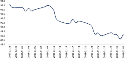 上周,美元指数先跌后涨,周中特朗普任内首份国情咨文报告和美联储货币政策会议均未能扭转美元颓势,但周五的非农就业报告提振美指小幅反弹,目前在89附近盘整。美指疲弱,加之结汇需求增加,带动人民币兑美元整体走升,最高涨破6.27关口,周五收于6.2798,当周累计上涨0.75%,为连续第八周升值。短期内,人民币料维持易升难贬走势。