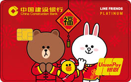 LINE FRIENDS粉丝信用卡是建设银行于2017年年底携手风靡全球的卡通形象LINE FRIENDS在中国大陆地区独家发行的信用卡产品。上市至今,这款产品先后推出了三套各具风格的卡面设计。2017年产品初上市,8款卡面以LINE FRIENDS特有的糖果色配以或独立或组合的形象构图,展现出亲和萌宠的卡面效果;2018年520表白节(5月20日)前夕,推出2款“纯爱版”卡片,以布朗熊可妮兔的情侣形象为主题,配以唯美粉色设计;2019年猪年新春前夕,“福运连连版”面世。至此,建设银行LINE FRIENDS粉丝信用卡经过不断“焕新”打造,已形成了颇具特色的产品系列,以丰富多变的风格诠释了金融产品与人气IP的深度结合,成为业内信用卡IP合作的典范,同时也对建设银行信用卡“人无我有、人有我全、人全我优、人优我极致”的产品创新理念做出了生动且时尚的注解。