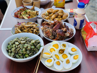 仅有豌豆饭还不够,得另外再加几个小菜,这个季节红烧龙虾、清炒蚕豆、干煸小土豆、竹笋炒蛋、流油咸鸭蛋都是时兴菜。等饭菜都烧好,搬出折叠式野餐桌和凳,就在户外一字排开,每人一杯冰红茶,一碗香香的豌豆饭,扯些不着边际的闲话,欢声笑语引得邻里都前来观望。