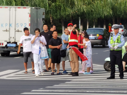 “业务部门都很忙,斑马线这个工作交给我好了!”文登支行安保部的老员工荣利是名转业军人,自告奋勇承包了门前的斑马线,从7月中旬开始,每天早、中、晚准时出现在斑马线前。8月29日,他正式退休,但看到同事们忙着季度末冲刺,说什么也不交接,成为年龄最大的一名“红马甲”。