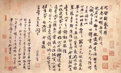 第三、四件作品的收信人都是苏轼的挚交陈慥,因此被后来的收藏者装裱在一卷之上,称为《新岁展庆 人来得书》卷,这是本展之中最为完整的苏轼作品,体现了他的书法发展到中期时的书风。《新岁展庆帖》应写于1082年的元月,苏轼在信中向老友致以新春的问候,同时告知自己正在建造书斋,有空时请他过来喝茶。最后向陈慥借了一件木制的茶臼子,以便仿制一个。补写中提到了自己的弟弟苏辙近来状况。后接的《人来得书》讲的却是一件悲痛的事情。原来苏轼得好友报信,陈慥的大哥突然去世,苏轼以下的书写均在宽慰好友,结尾处表达了不能前往吊唁的遗憾之情。这两件作品的字数最多,从中可见苏轼在学习了王羲之书风之后,改学唐代的柳公权,承接了他的瘦劲书笔,因此,这两件作品既有姿态的清秀,又有挺拔劲健,为苏轼传世书迹中的精品。