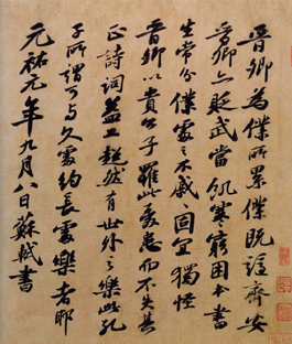 第五件作品《题王晋卿诗后》,写于元祐元年(1086年)苏轼49岁之时。此时他已重新被召回京城,并被委以高官。他与患难的好友王诜再次相聚,喜不自禁。王诜不但精于绘画,亦工于诗作。苏轼在题跋中借点赞诗作的同时重点赞美了好友的为人品质。他引用孔子的话:“此孔子所谓可与久处约长处乐者耶!”表明王诜是一位患难与共的朋友,充满了敬意。此件作品上的书写,挥洒自如,不加修饰,字形偏平,同时向右上方倾斜,体现了苏轼最典型的书风“石压蛤蟆体”。