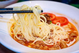 最好吃的是拉面。在煤矿上班的父亲,每到年根,会骑一辆老旧的“二八自行车”,后座上驮着50斤的一大袋白面(小麦粉),骑行百十里路回家来。50斤的白面,是父亲一年吃食堂省出来的细粮,够我们吃上一年,当然只是腊月里用来蒸制过年的枣馍、花馍,大年初一到初五包饺子,还有我们兄妹四人过生日要吃的拉面。面在炒制西红柿酱之前已在陶瓷盆里和好,搭一块半湿的笼布,等香喷喷的西红柿酱的气味飘散开来,面已饧好。变得圆润光滑的面团,堆在案板上,赶至手掌宽,一指厚的面皮,再刀切成约一指宽的小面棒,两头翘起刀口切出的尖角,样子像极了葡萄叶子上嫩绿的、胖胖的肉虫。